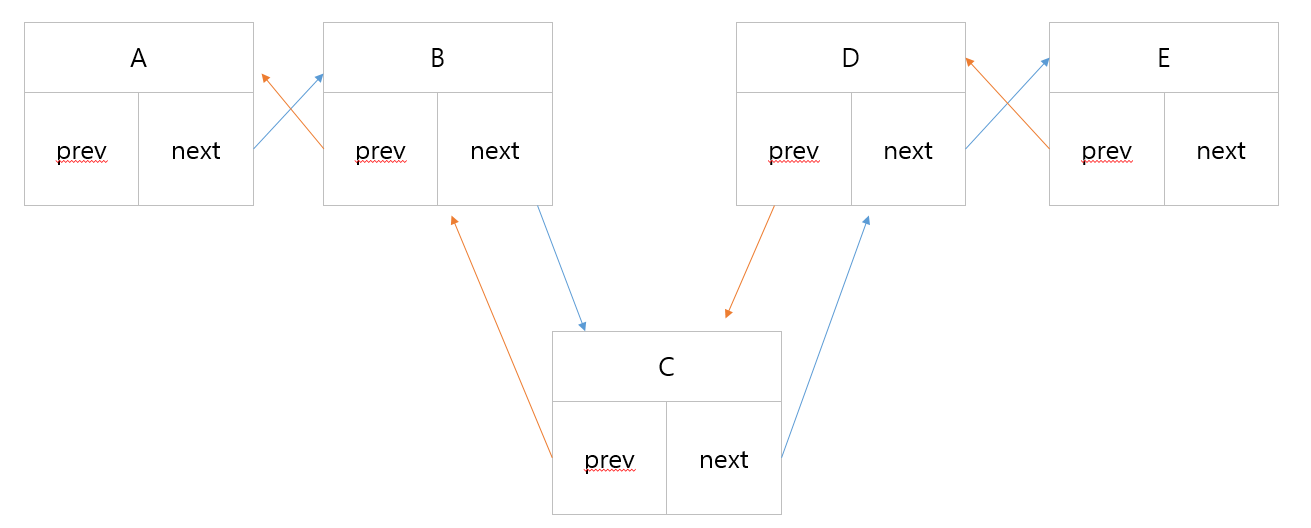 X-1.next 에는 X+1의 값이 있어야 하고, X+1.prev에는 X-1의 값을 가지고 있어야 합니다.