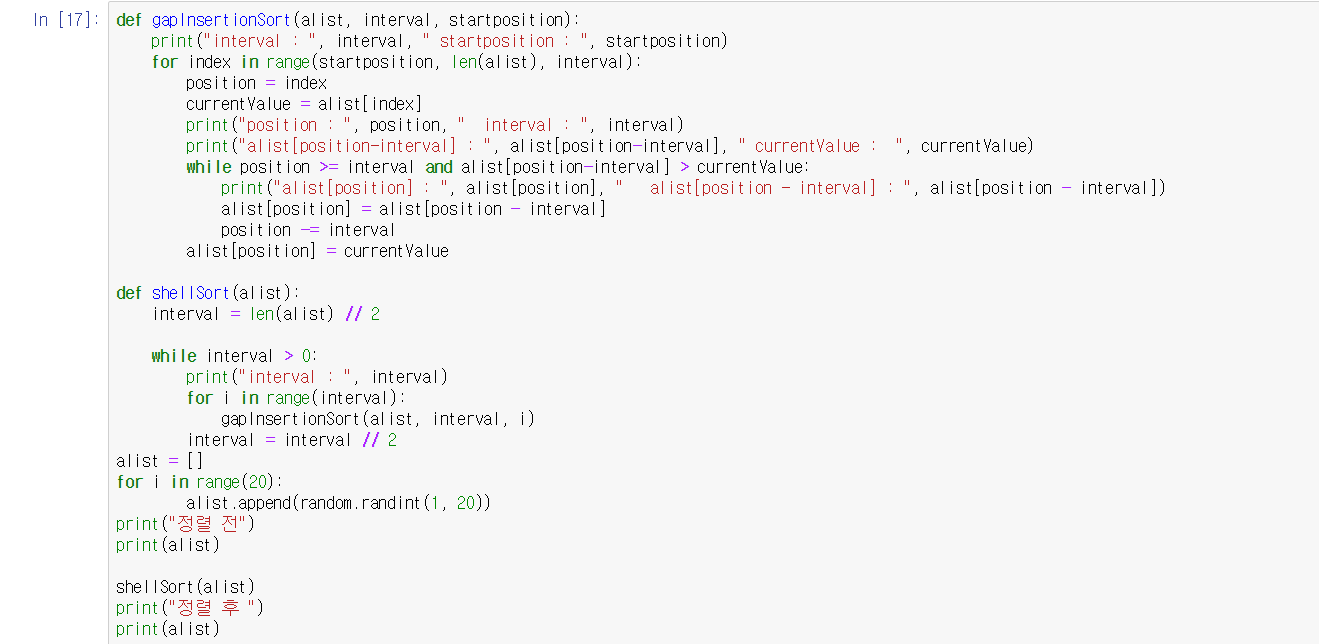 def shellSort는 껍대기고 gapInsertSort가 핵심 기능입니다. shellSort에서는 리스트를 입력으로 받고 interval 값을 줍니다. 먼저 len(list) // 2를 해서 절반으로 값을 넘겼네요. 그래서 처음에는 길이가 20인 배열 기준으로 10만큼 간격을 두며 배열 정렬을 합니다.