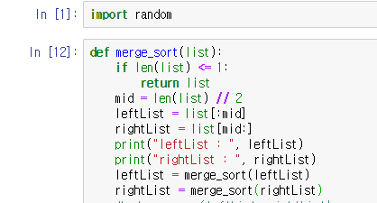 아까 그럼에서 보셨다싶이 왼쪽, 오른쪽 나눠지고 정렬을 진행합니다. 위 진행 상황을 보면 leftlist와 rightlist가 나눠지는데 먼저 leftlist 기준으로 또 left와 right로 나눕니다. 이게 1개씩 들어갈 때까지 계속 나눕니다