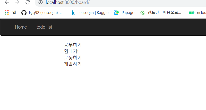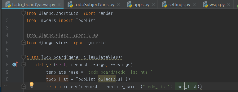 그리고 그 결과 값을 {"todo_list": todo_list} 에 담아서 이제 template으로 넘겨줍니다~