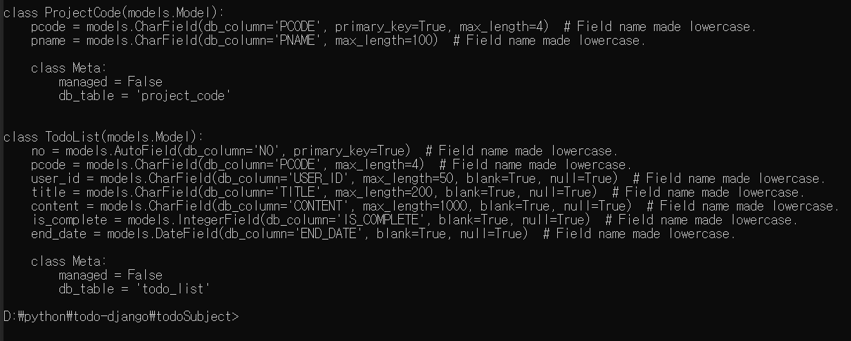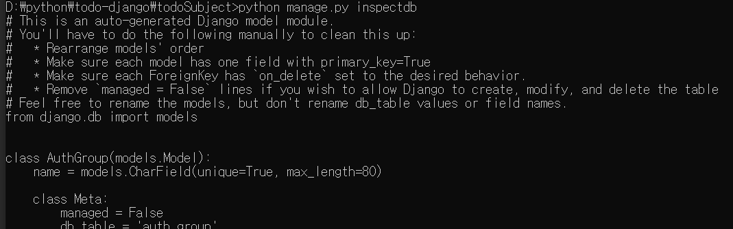 python manage.py inspectdb 명령어를 통해