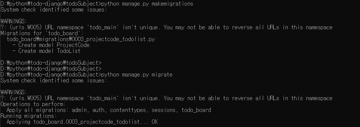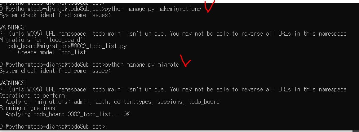 여기서 makemigrations와 migrate 명령어가 있습니다.