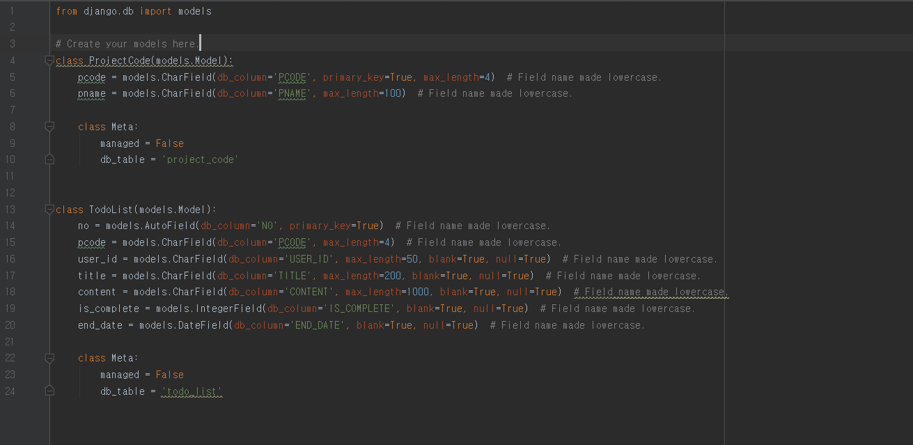 보통은 이렇게 models 파일에 값을 설정합니다. class가 하나의 테이블이라고 생각하시면 됩니다