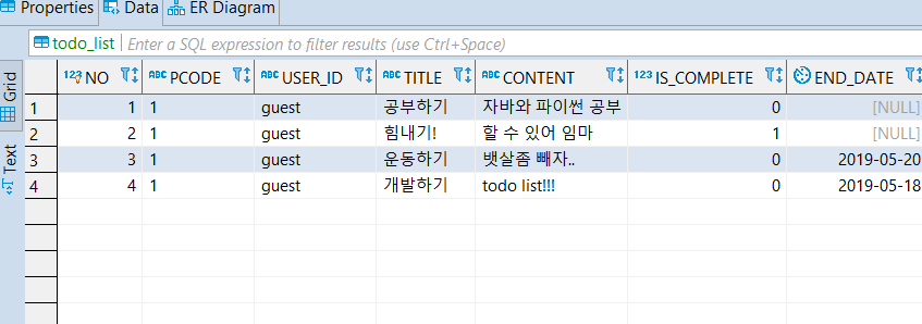 insert into TODO_LIST(PCODE, USER_ID, TITLE, CONTENT, IS_COMPLETE, END_DATE) values('1', 'guest', '개발하기', 'todo list!!!', false, '2019-05-18');