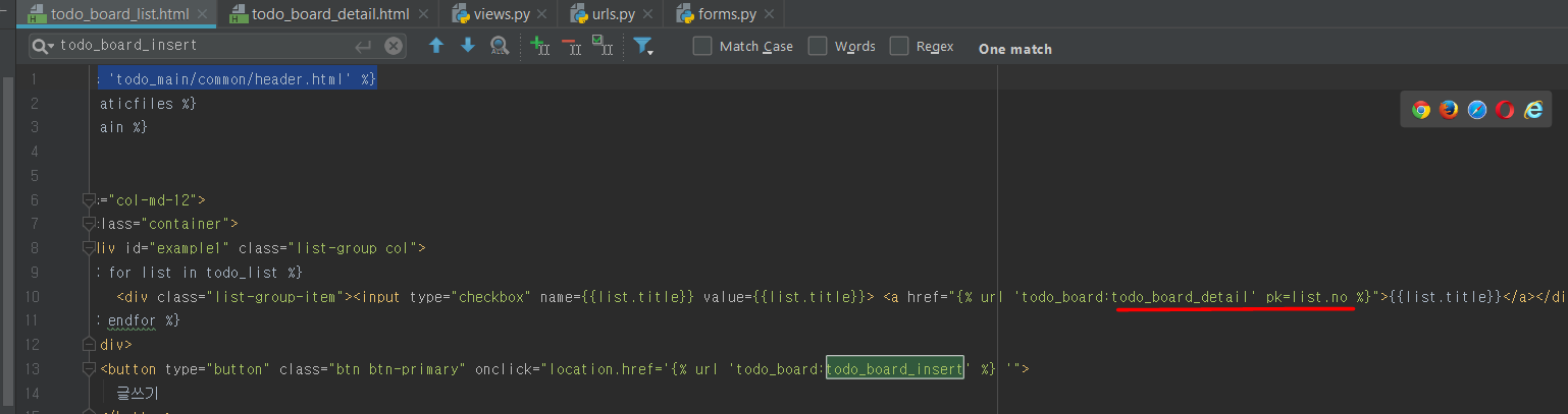 만약 클릭을 했을 때 todo_board:todo_board_detail의 url로 가게 하는데! pk 값을 list.no로 설정해라! 라는 것입니다