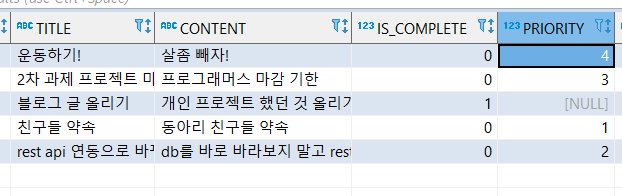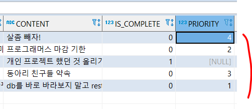 자! 이렇게 나와있습니다. 1번 pk를 가진 todo는 4번째 우선순위, 2번 pk 값은 3번째 우선순위를 가지고 있네요
