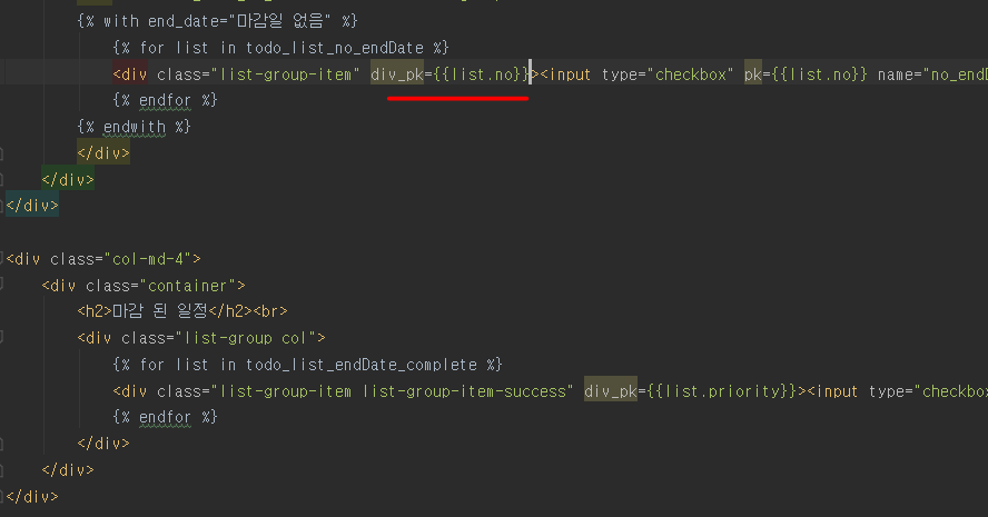 그러기 위해서 먼저 위와 같이 div 영역에 div_pk라는 임의의 속성을 두어야 합니다. 이 속성을 이용해서 정렬 데이터를 핸들링할 것입니다. 이 속성 값에는 list.no 즉, pk 값을 넣어줍니다