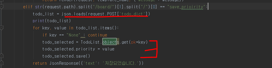 그리고 ajax를 통해서 todo_board:todo_board_save_priority로 넘겨주게 합니다.