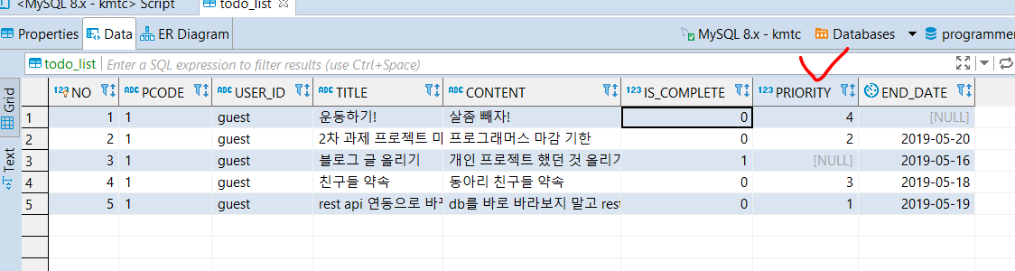 먼저 DB에서 PRIORITY 컬럼을 추가해줬습니다. 이 정보에는 우선순위에 대한 정보가 들어가있는데요