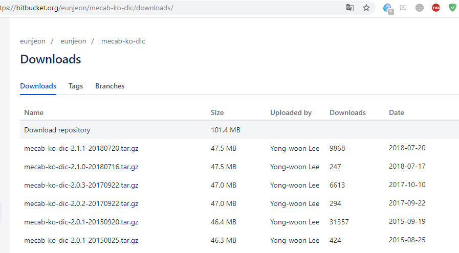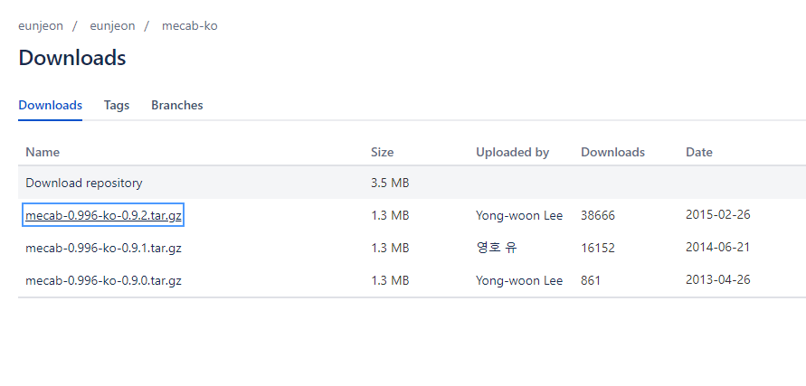 위 화면도 앞서 말씀드린 mecab 사이트에 있습니다. 저는 여기서 제일 최신에 나온 것을 받았습니다.