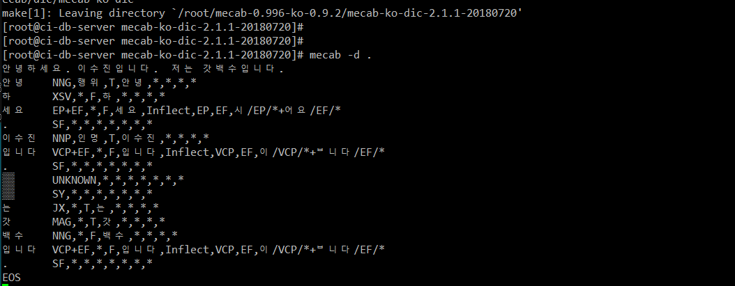 한국어 단어 사전이 있는 mecab-ko-dic 부분에 위치를 하셔서 mecab -d . 를 입력합니다