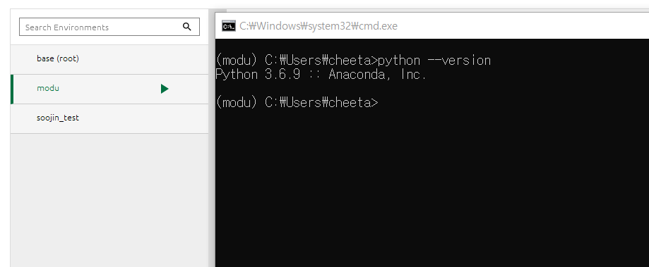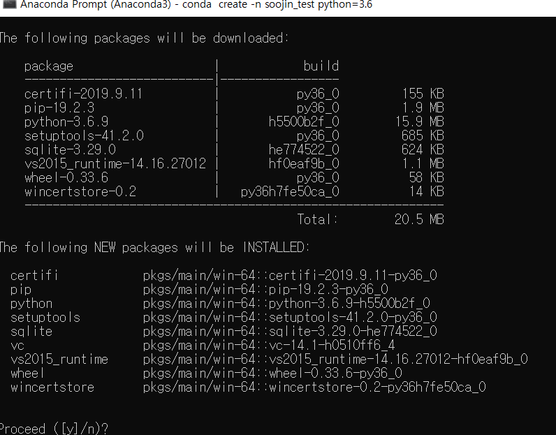 conda create -n soojin_test python=3.6을 통해 python 환경 이름을 soojin_test로 하고