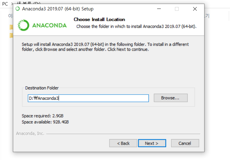 저는 C에 용량이 얼마 없기 때문에 D 드라이브에 anaconda를 설치하겠습니다.