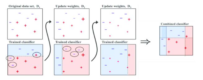 두 번째 그림에서 + 가 커진 것을 볼 수 있습니다. 가중치가 부여된 것이죠. 그리고 또 다른 classifier가 예측을 했는데 틀린 부분에 대해서 또 가중치를 부여합니다.