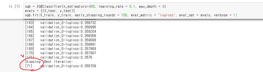 stopping. Best Iteration을 보여주면서 71번째가 best라고 보여줍니다.