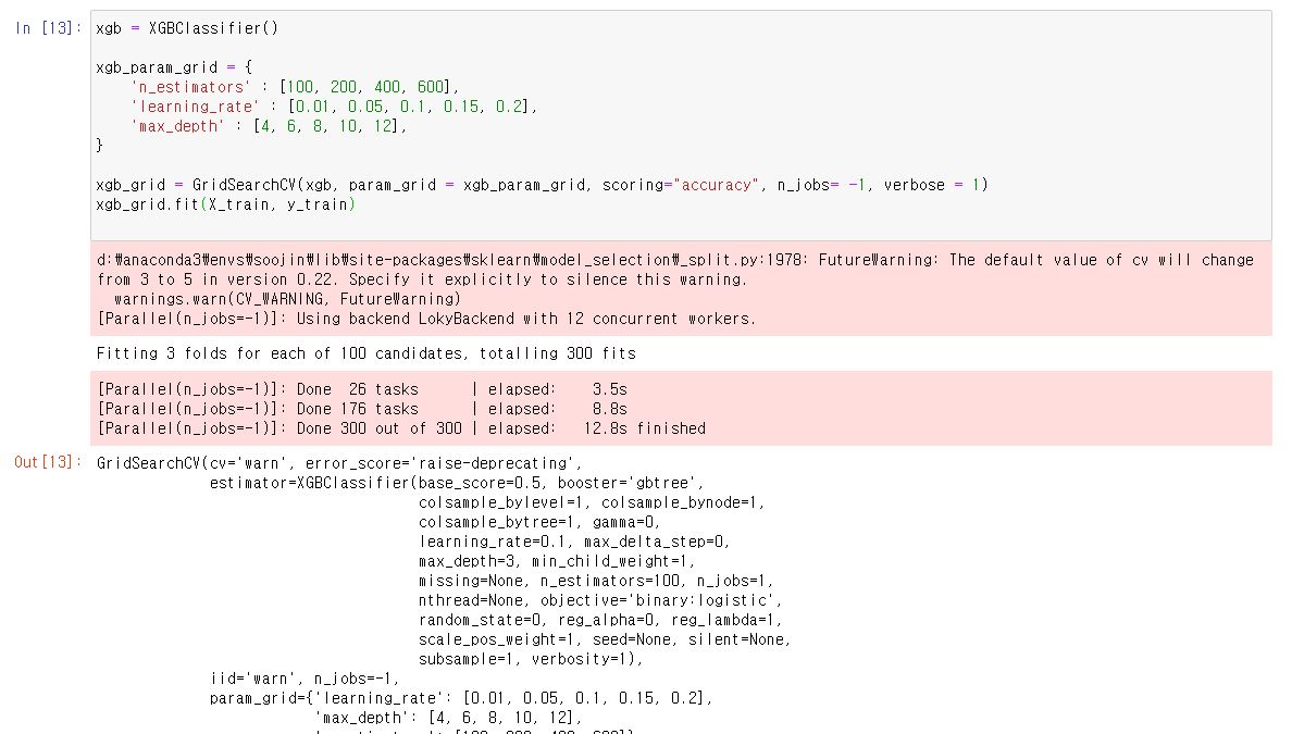 모델이 무겁고 시간이 오래걸리므로 xgboost의 hyperparameter 튜닝은 적게 진행하겠습니다.