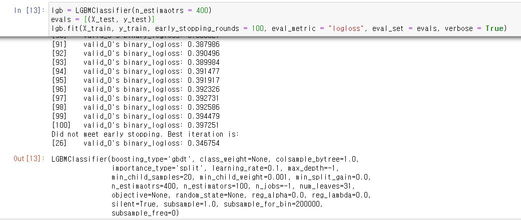 또한, xgboost때와 마찬가지로 lightgbm도 early stopping(조기 종료)를 제공해줍니다.
