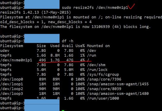 sudo resize2fs /dev/nvme0n1p1 과같이 확장을 시켜주면 됩니다.