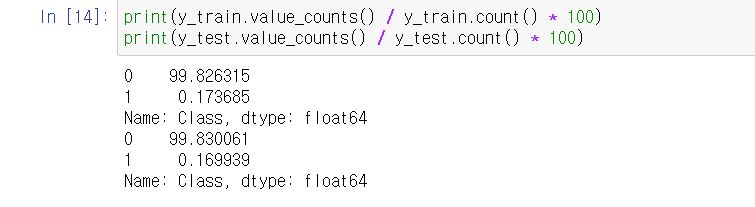 그래서 train과 test의 비율을 확인해보니 원본 데이터의 비율인 99.8% vs 0.02% 정도의 비율로 비슷하게 나누어졌네요.