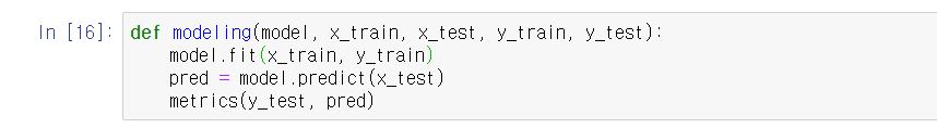 함수 이름은 modeling이고 원하는 model과 train, test 데이터를 인자로 받습니다.