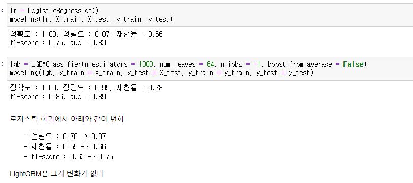 지난 포스팅에서 로지스틱 회귀(logistic regression)과 lightgbm 2개의 머신러닝 모델을 적용해서