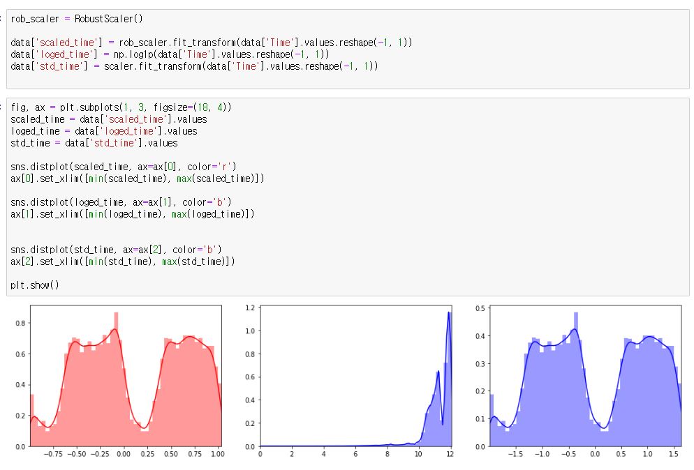 Time에서는 Robust scale과 log scale, standard scale 3개의 scaler로 데이터 normalization을 진행하겠습니다.
