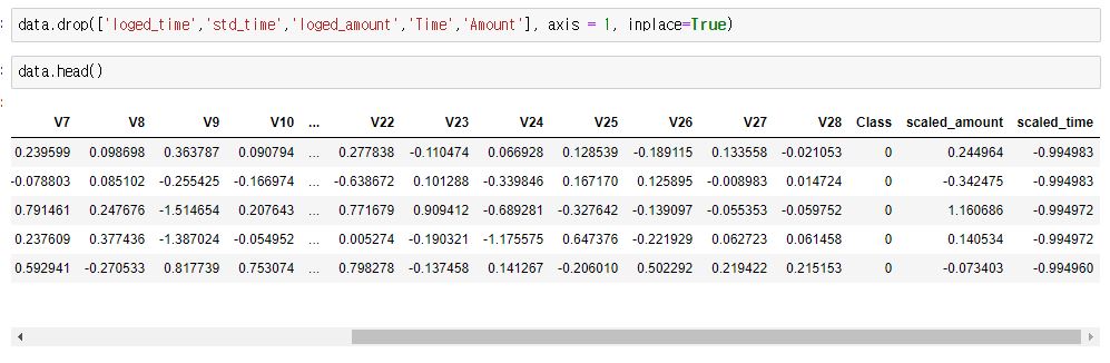이제 Amount와 TIme 데이터를 이 정규화된 데이터로 바꿔주고 기존에 불필요한 데이터는 drop하겠습니다.