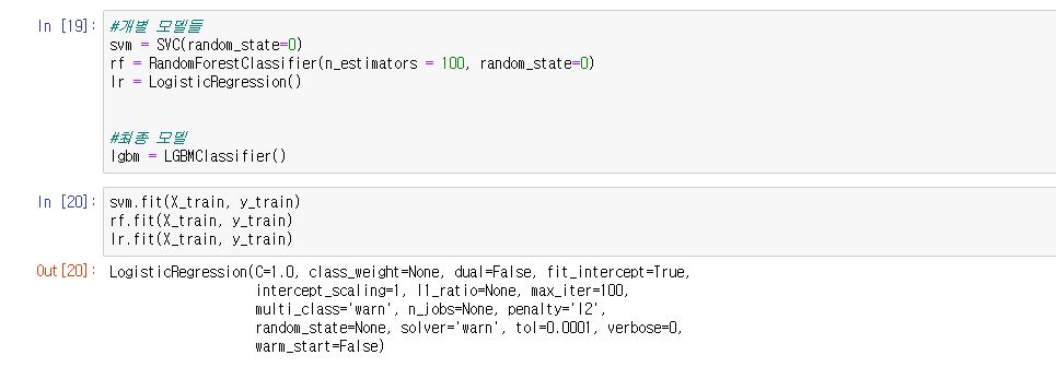 저는 개별 모델은 SVM, 랜덤 포레스트(random forest), 로지스틱 회귀(logistic regression)을 사용했습니다.