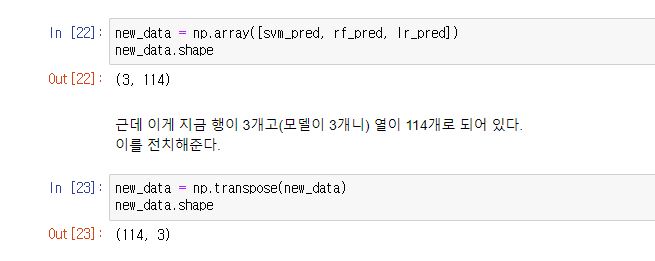 new_data = np.array([svm_pred, rf_pred, lr_pred])와 같이 쌓으시면 됩니다.