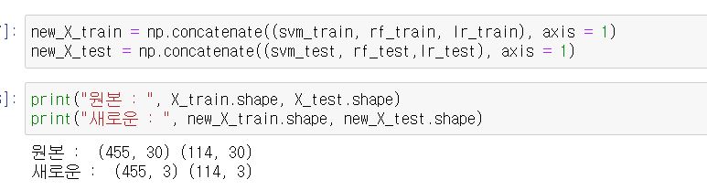 np.concatenate를 이용해서 axis = 1을 기반으로 stacking 해줍니다. 그러면 기존에 30개였던 feature가 3개(모델 개수)만큼 줄어듭니다.