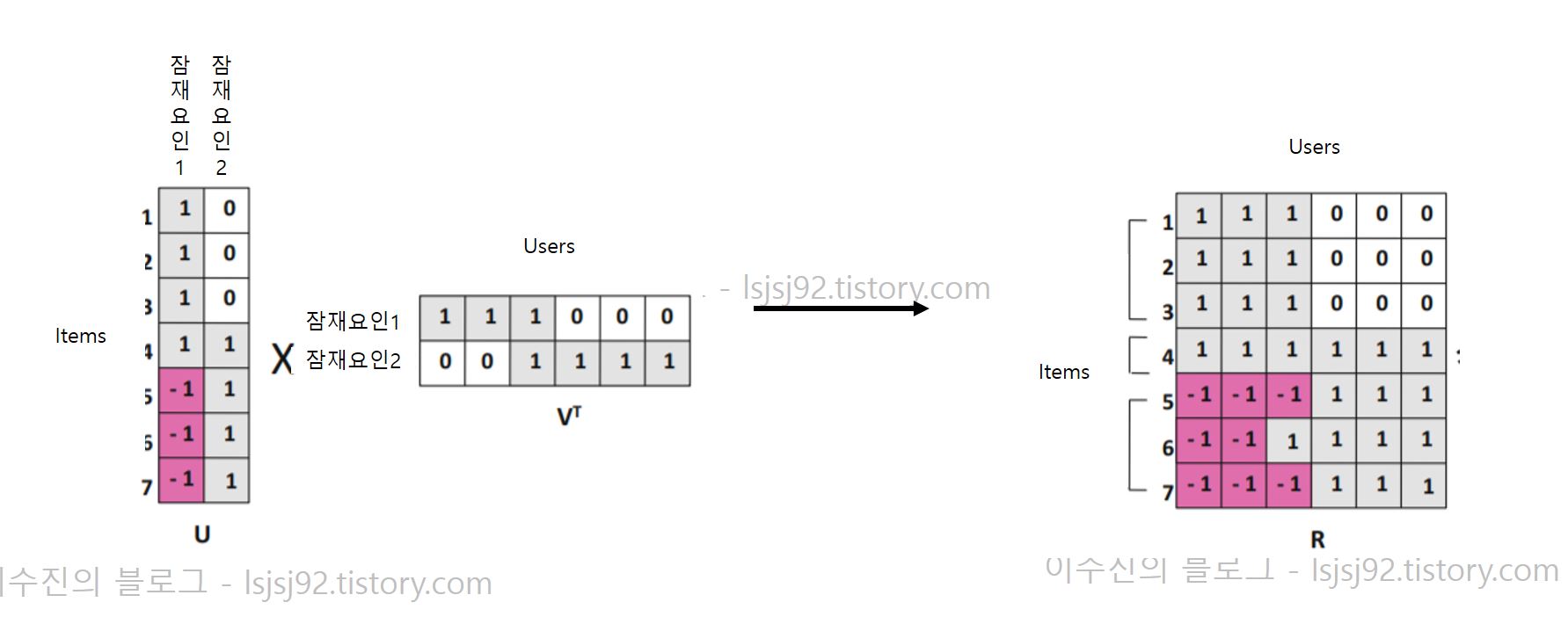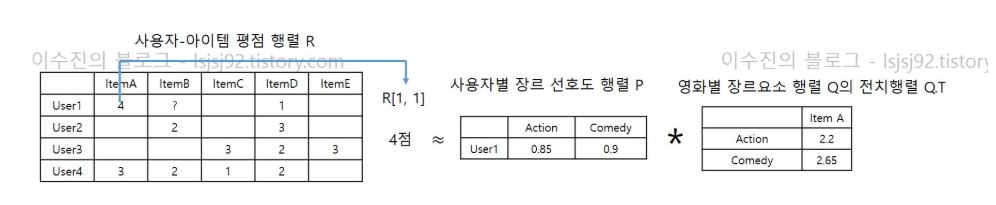 '사용자-장르', '장르-아이템' 과 같이 2개의 행렬로 분해될 수 있는 것입니다.