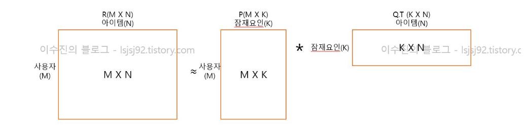 즉, 사용자-아이템 행렬을 '사용자-잠재요인', '아이템-잠재요인' 행렬로 분해할 수 있습니다. 아래 사진처럼요!