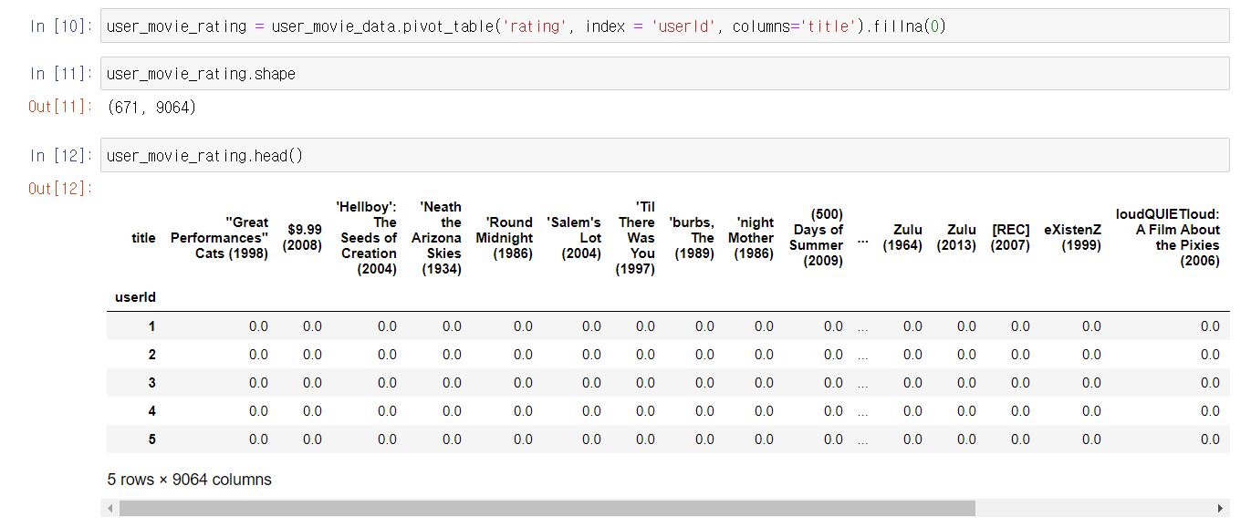 user_movie_data.pivot_table('rating', index = 'userId', columns='title')로 바꿔주면 사용자-영화 평점 데이터로 변경해줍니다.