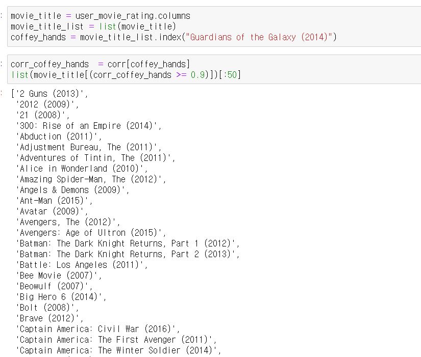 이렇게 나온 상관계수를 이용해서 '특정 영화'와 관련하여 상관계수가 높은 영화를 뽑아주면 됩니다.