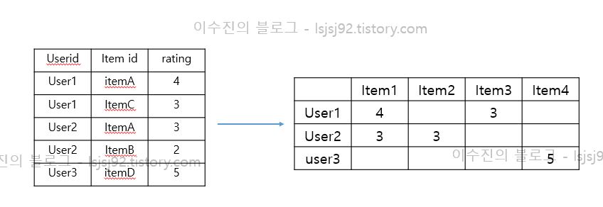 지금은 user, movie, rating이 각각 컬럼에 존재하는데요. 이렇게 생긴 데이터를 value를 평점으로 column은 movie로, row는 user id로 바꿔주어야 합니다. 아래 그림처럼요!
