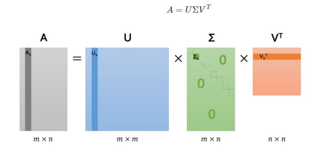 SVD라는 것은 특이값 분해라고도 불리웁니다. M x N 크기의 데이터 행렬 A를 아래와 같이 분해합니다.