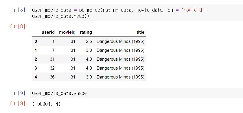 하나로 합쳤습니다! 그러면 특정 유저가 영화에 대해 평점을 매겼는데 그 영화의 제목(title)이 무엇인지 알 수 있게 되었습니다.