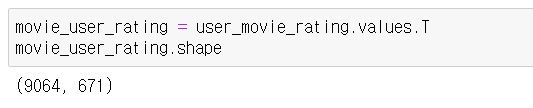 이렇게 전치로 바꿔주면 행은 9064개의 영화 데이터가 되고 열은 671개의 사용자 데이터가 됩니다.