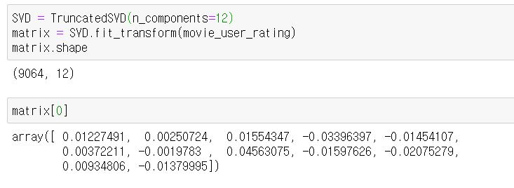 그리고 SVD.fit_transform을 통해 변환을 하게 되면 9064개의 영화 데이터가 12개의 어떤 요소의 값을 가지게 됩니다.