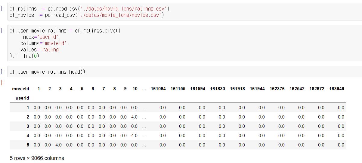 먼저, 사용자-영화 평점 데이터를 pivot table 형식으로 바꿔줍니다.