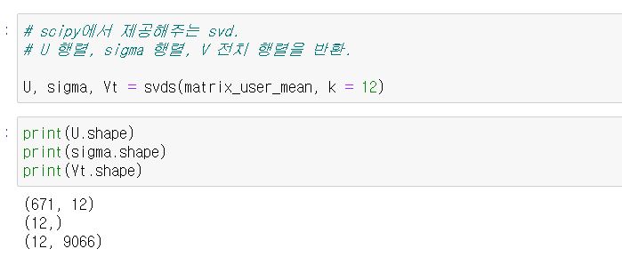 그래서 scipy에 있는 svd를 이용해 U, Sigma, Vt를 받을 수 있도록 합니다. 또한, scipy에서 제공해주는 scipy.sparse.linalg.svds는 TruncatedSVD 개념을 사용하므로 이것을 사용하겠습니다.