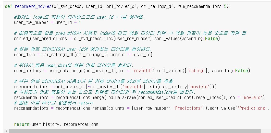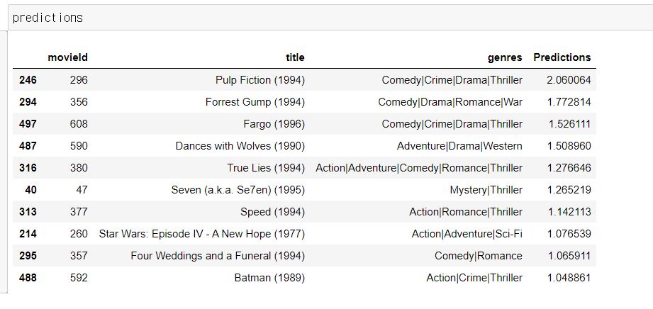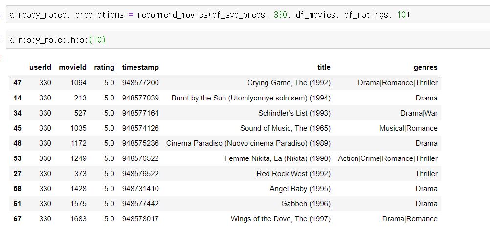 - 사용자 아이디에 SVD로 나온 결과의 영화 평점이 가장 높은 데이터 순으로 정렬