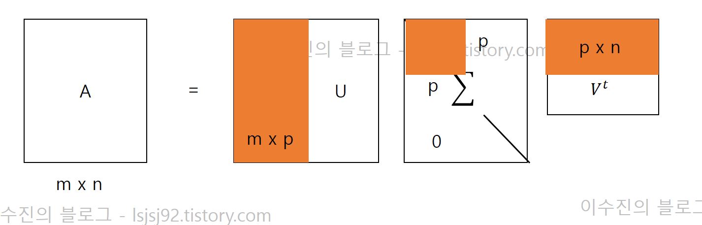 즉, ∑ 행렬의 대각원속(특이값) 가운데 상위 p개를 골라낸 것입니다. 이렇게 하면 기존 행렬 A의 성질을 100% 원복할 수 없지만 기존 행렬 A와 거의 근사한 값이 나옵니다.