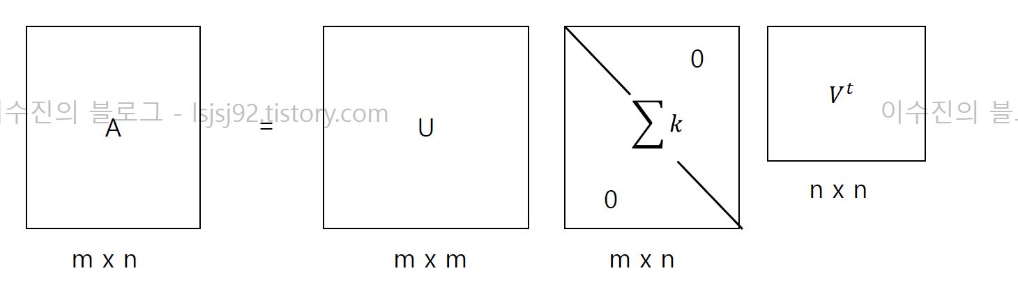 우리나라 말로 특이값 분해라고 불리우는 SVD는 m x n 크기의 데이터 행렬 A를 아래와 같이 분리하는 것을 말합니다.
