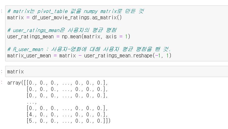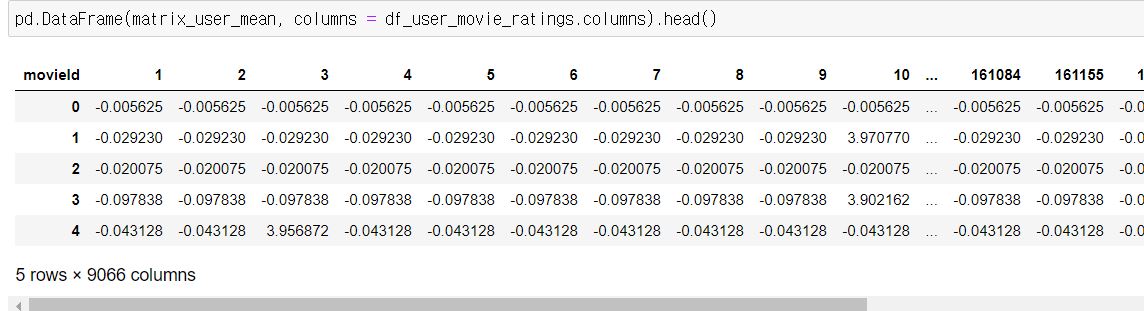 - 이를 user의 평균 점수를 빼서 matrix_user_mean 이라는 행렬로 만듬