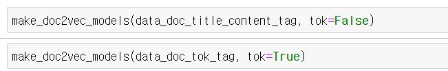 형태소 분석기 결과 데이터는 tok=True로 보냅니다. 그러면 각각 데이터에 맞게 doc2vec 모델이 저장됩니다.