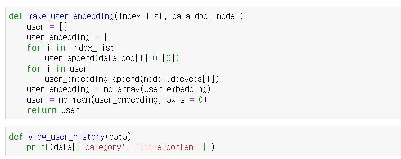 다음은 make_user_embedding입니다. content vector 기반의 user history를 평균해서 user embedding을 만들어주는 함수입니다.
