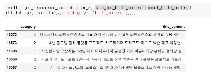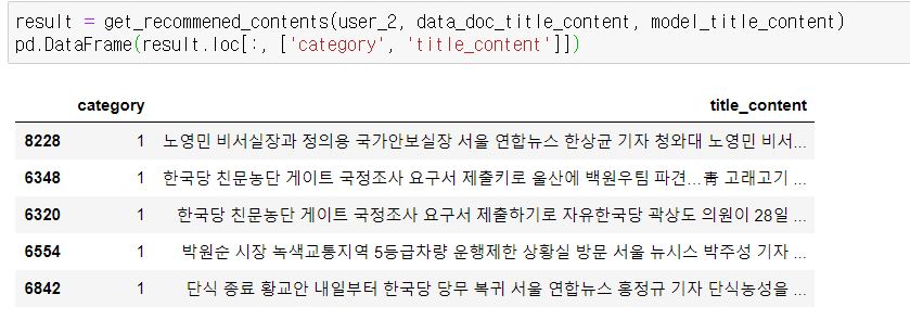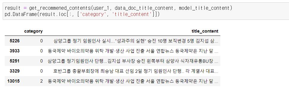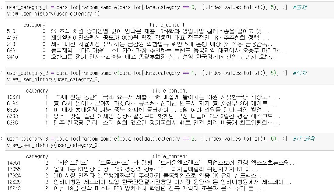 user 3의 추천 결과를 보니 category 2 즉, IT과학의 뉴스를 추천 받은 것을 볼 수 있습니다.