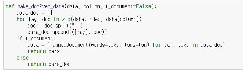 다음은 make_doc2ved_data 함수입니다. doc2vec에 필요한 데이터를 만들어줍니다.