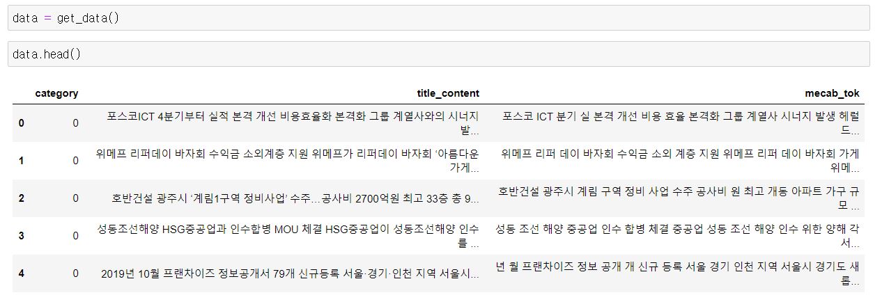 그리고 title_content는 뉴스 기사의 제목과 본문을 합친 결과이며 mecab_tok은 mecab을 이용해 형태소 분석한 결과입니다.